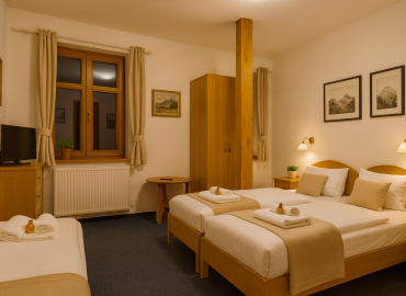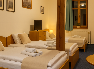 Praktický třílůžkový pokoj pro kamarády či menší rodinu. Vše po ruce, pohodlné spaní a dost místa na batohy i výbavu. Součástí pobytu je Welcome Box + QR kód na zvýhodněné nákupy na pokoj. Den začnete bohatou hotelovou snídaní v ceně.