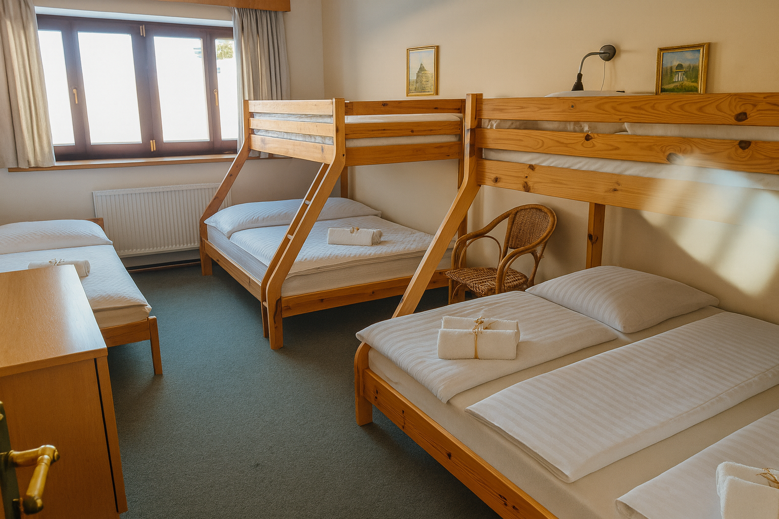 Velký společný pokoj pro až 7 osob – ideální pro přátele, menší tým nebo vícečlennou rodinu. Všichni spolu, pohodlně a s výhledem na hory. V ceně je i Welcome Box ‘Ochutnej Jeseníky’ – malé lokální dobroty na uvítanou. Snídaně v ceně – podáváme v restauraci hotelu Franz, necelých 100 m od Orlíku.
