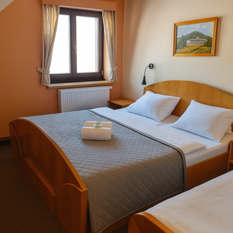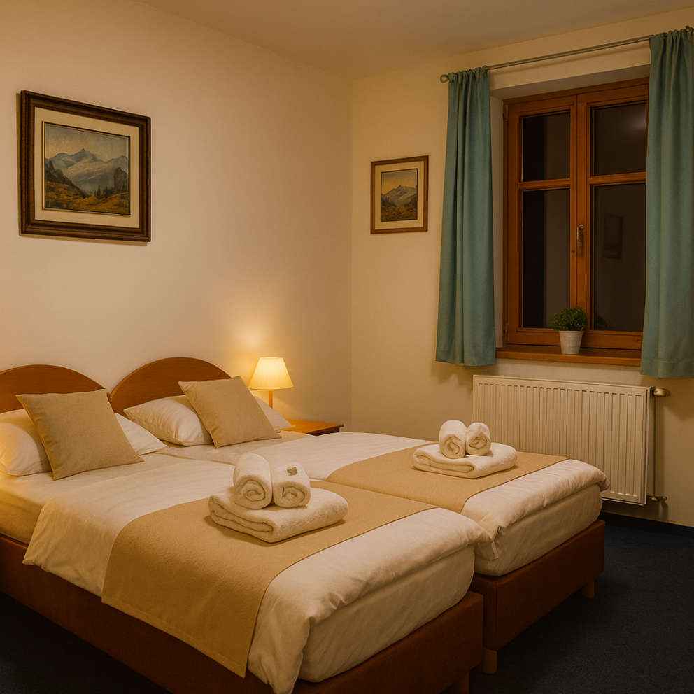 Prostorné 4 lůžko pro partu i rodinu – pohodlí, klid a hory přímo z okna. Součástí pobytu je Welcome Box + QR kód na zvýhodněné nákupy na pokoj. Snídaně v ceně – podáváme v restauraci hotelu Franz, necelých 100 m od Orlíku.