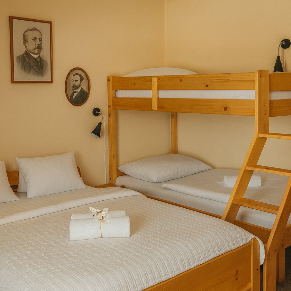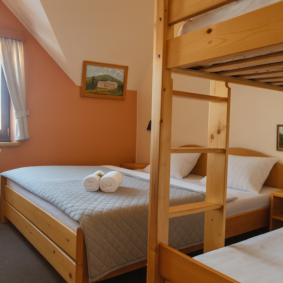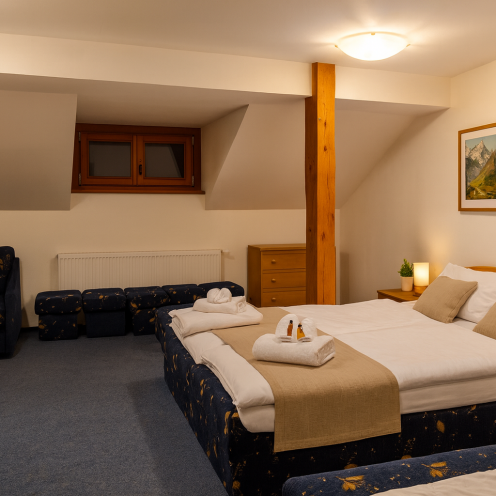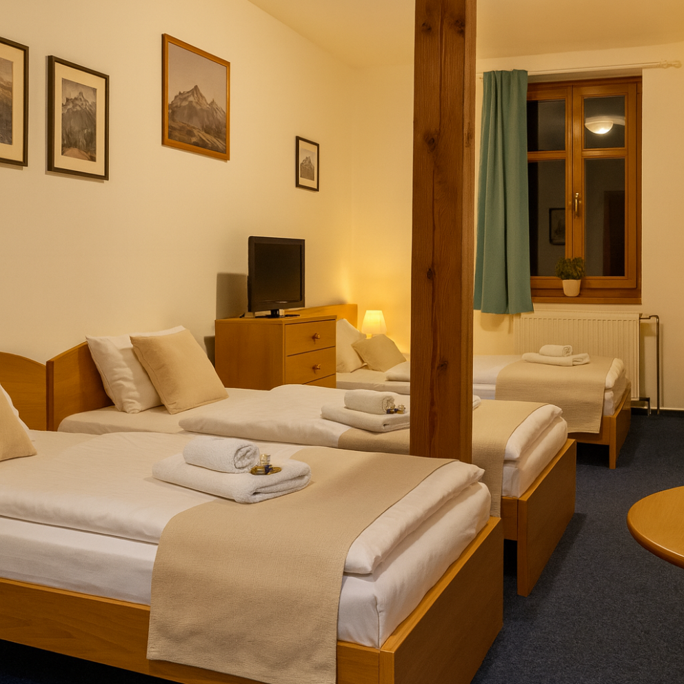 Praktický třílůžkový pokoj pro kamarády či menší rodinu. Vše po ruce, pohodlné spaní a dost místa na batohy i výbavu. Součástí pobytu je Welcome Box + QR kód na zvýhodněné nákupy na pokoj. Den začnete bohatou hotelovou snídaní v ceně.