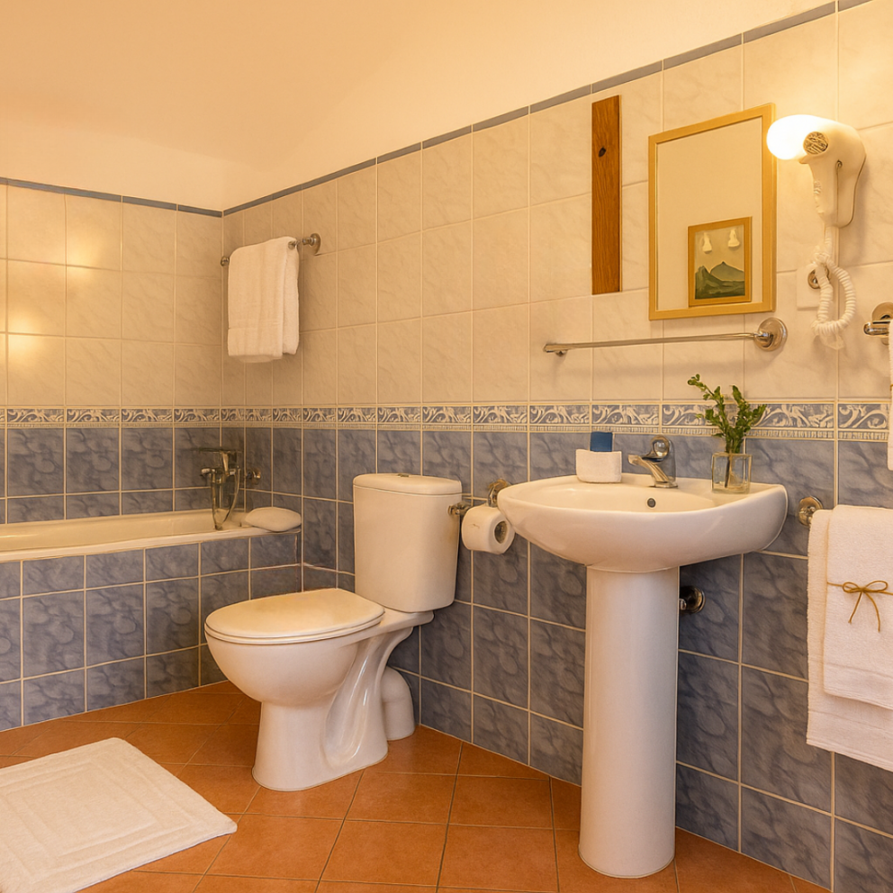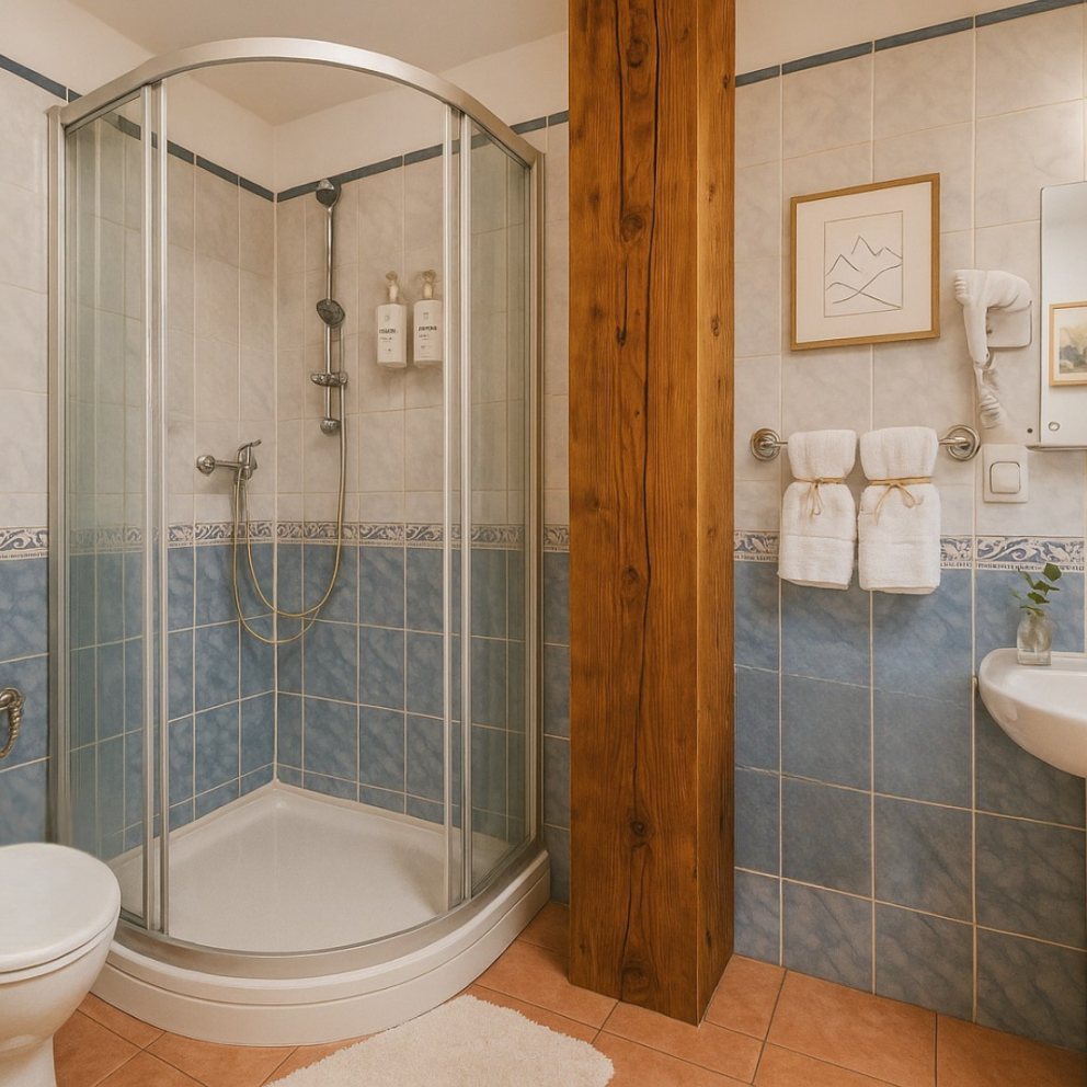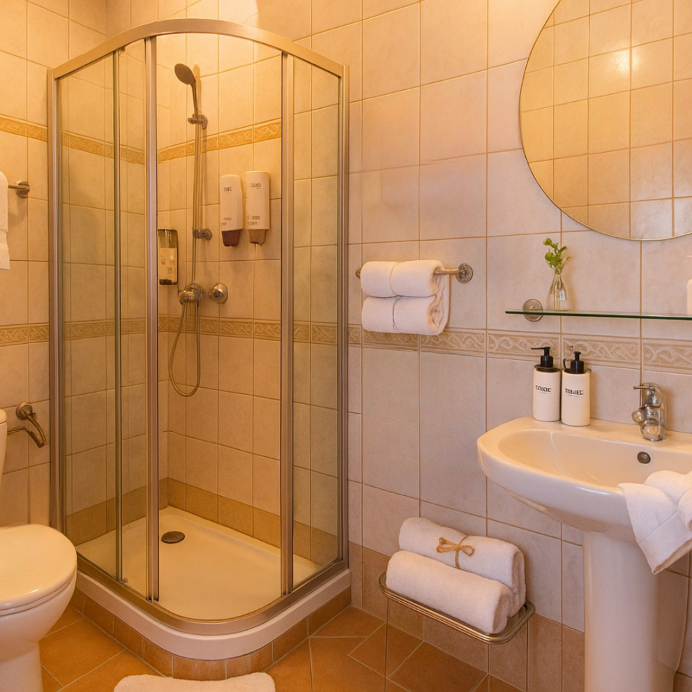 Každý pokoj má soukromou koupelnu se sprchou, fén, úložné prostory a hotelovou kosmetiku (šampon, sprchový gel a tělové mléko). Varnou konvici rádi připravíme na vyžádání.