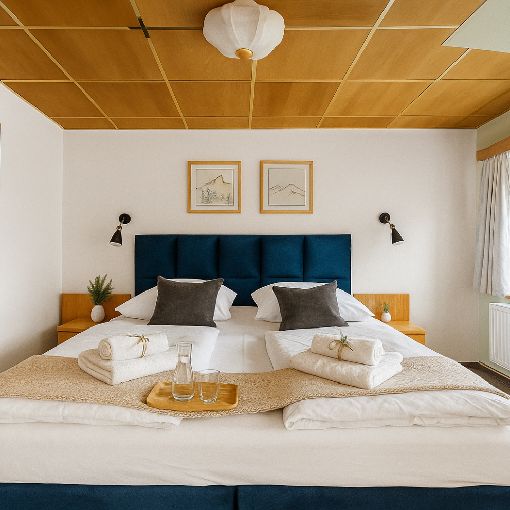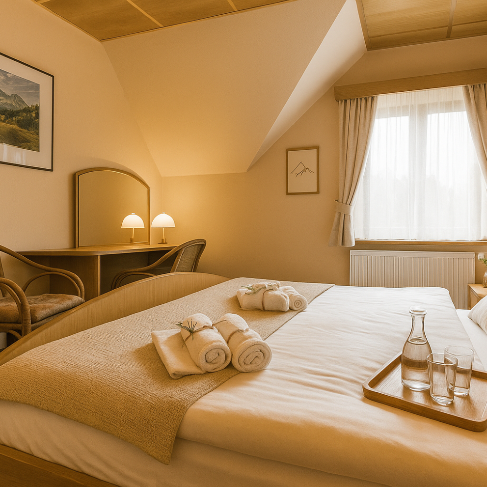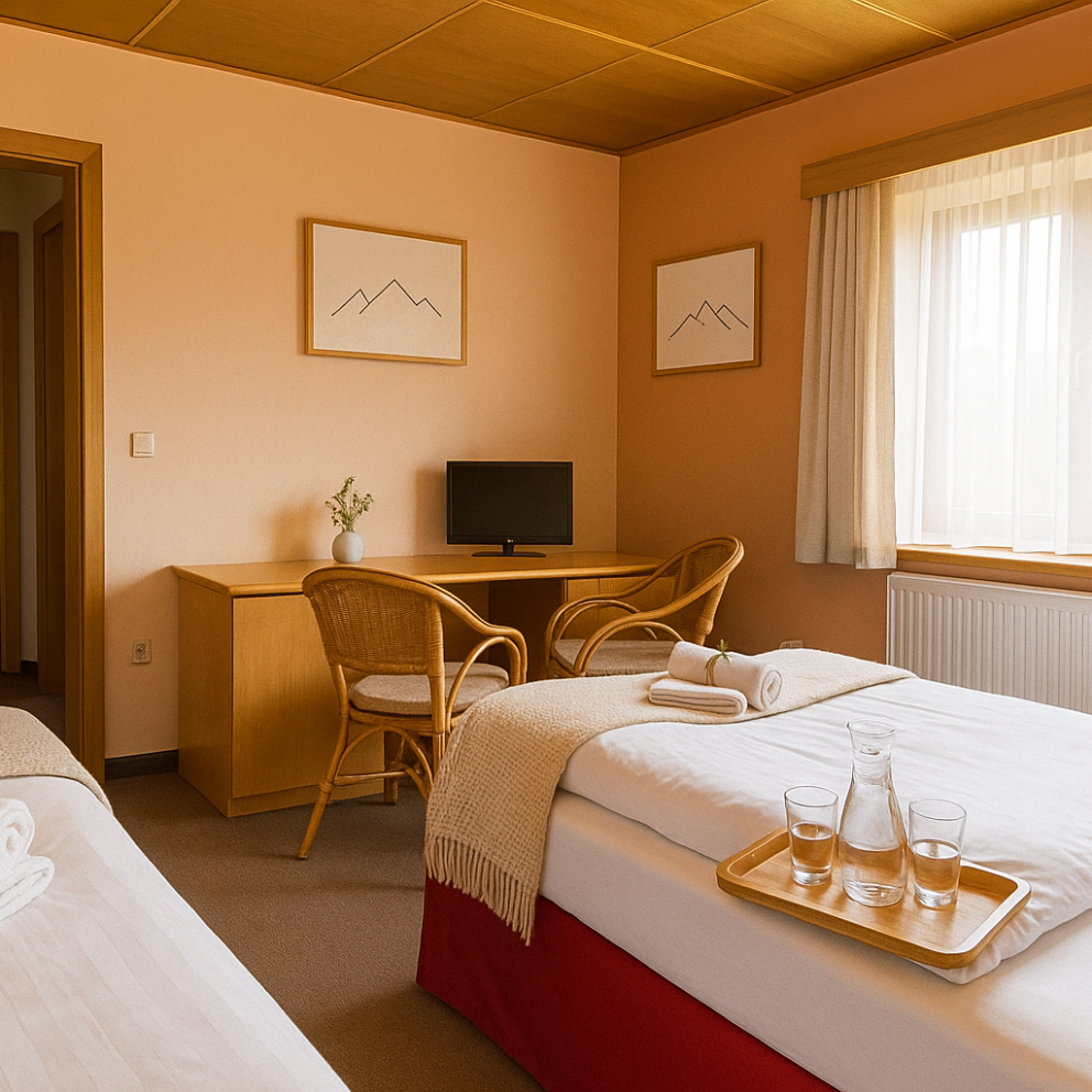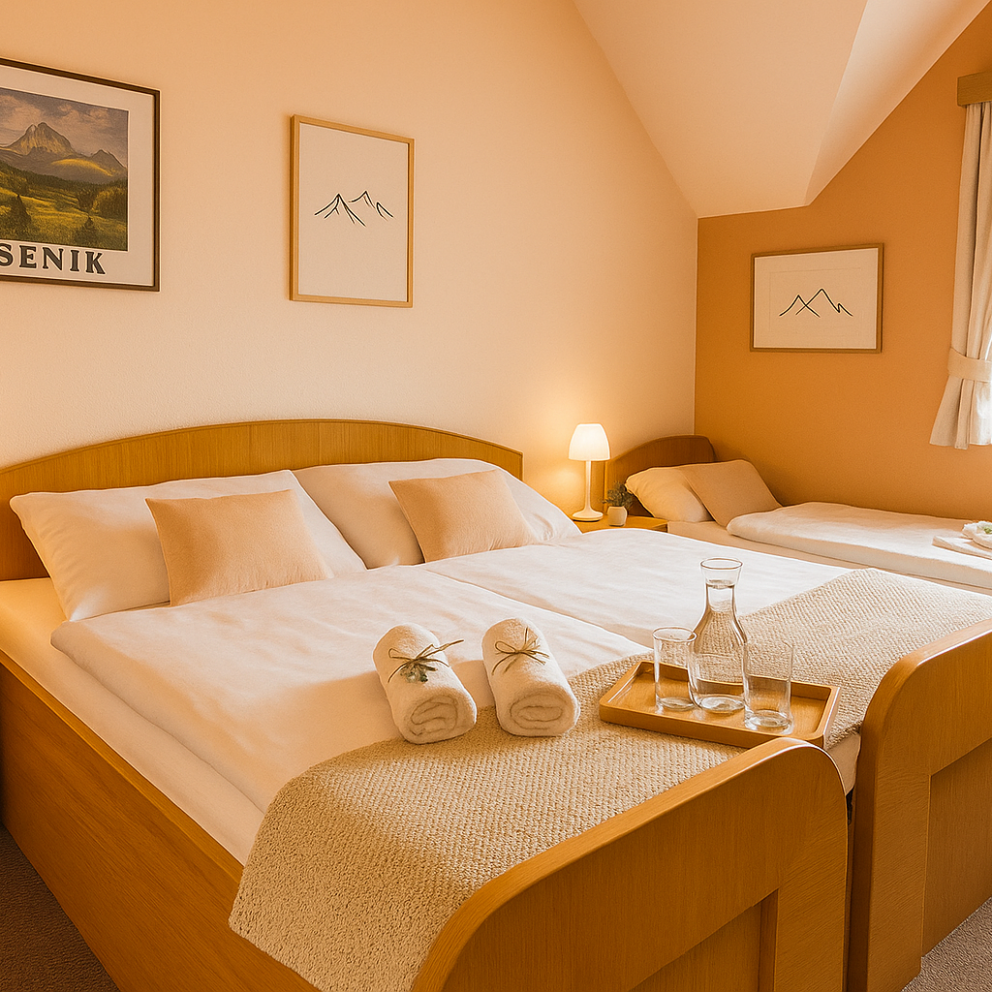 Velký společný pokoj pro až 7 osob – ideální pro přátele, menší tým nebo vícečlennou rodinu. Všichni spolu, pohodlně a s výhledem na hory. V ceně je i Welcome Box ‘Ochutnej Jeseníky’ – malé lokální dobroty na uvítanou. Snídaně v ceně – podáváme v restauraci hotelu Franz, necelých 100 m od Orlíku.