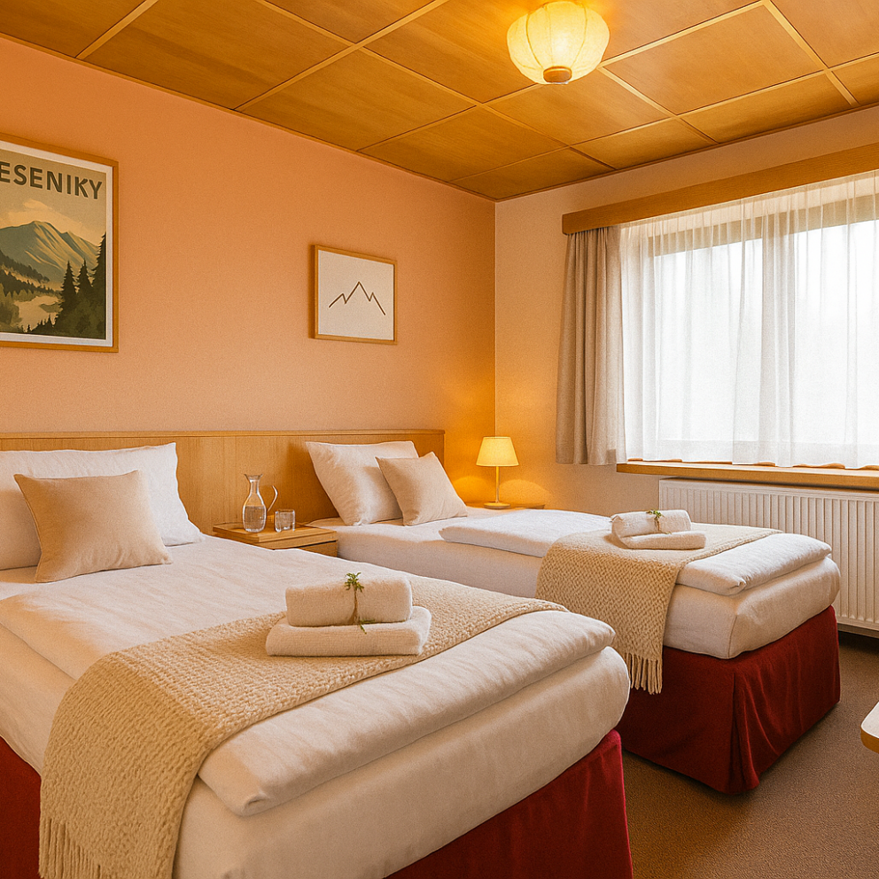 Nejflexibilnější varianta pro větší skupiny. Spousta místa na zavazadla i výbavu, klidné noci a panoramata Jeseníků. Součástí pobytu je Welcome Box + QR kód na zvýhodněné nákupy na pokoj. Skvělá snídaně je v ceně – podáváme v restauraci hotelu Franz, necelých 100 m od Orlíku.